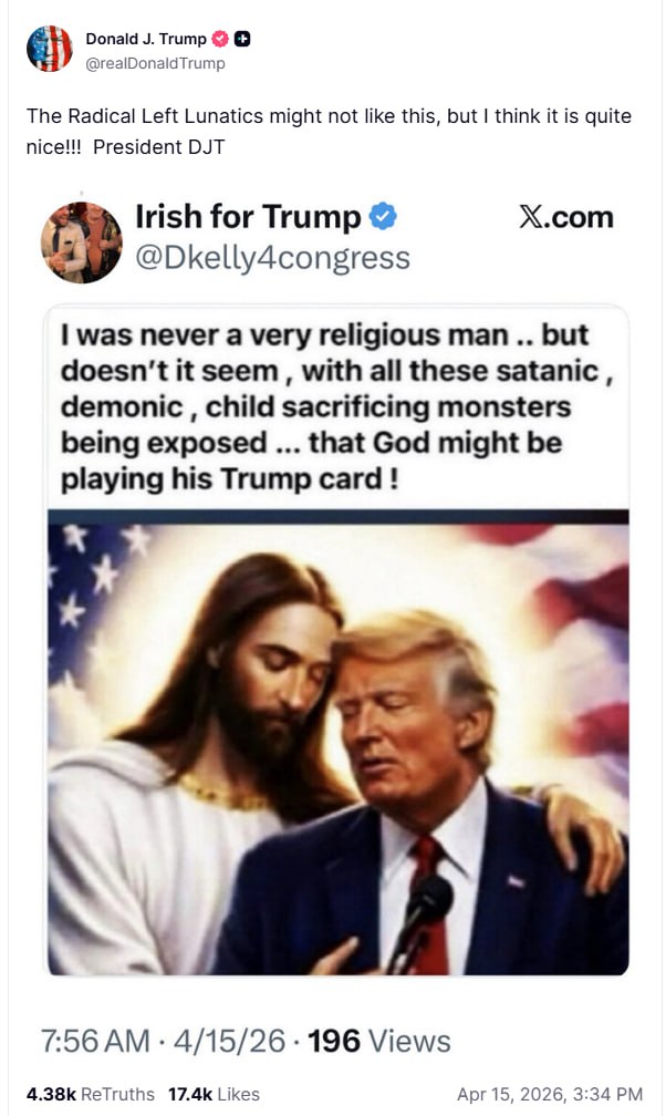Трамп снова опубликовал ИИ фото, где он обнимается с Иисусом, и назвал это милым.